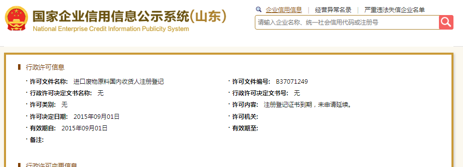 作为一家主营塑料原料、废塑料、石油焦、废钢、钢轨、铝材、橡胶、炉料、金属磨料的销售等方面的公司,其注册登记证书却早已到期。国家企业信用系统显示,该企业进口废物原料国内收货人注册登记证书已于2015年9月到期,且并未申请延续。