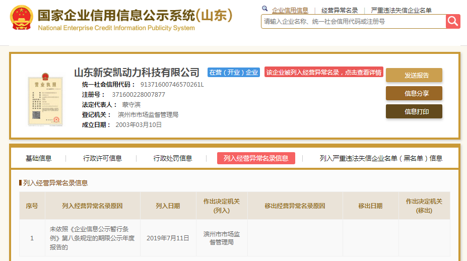 此外,新安凯还曾于2019年7月,因未依照《企业信息公示暂行条例》第八条规定的期限公示年度报告,被滨州市市场监督管理局列入经营异常名录。