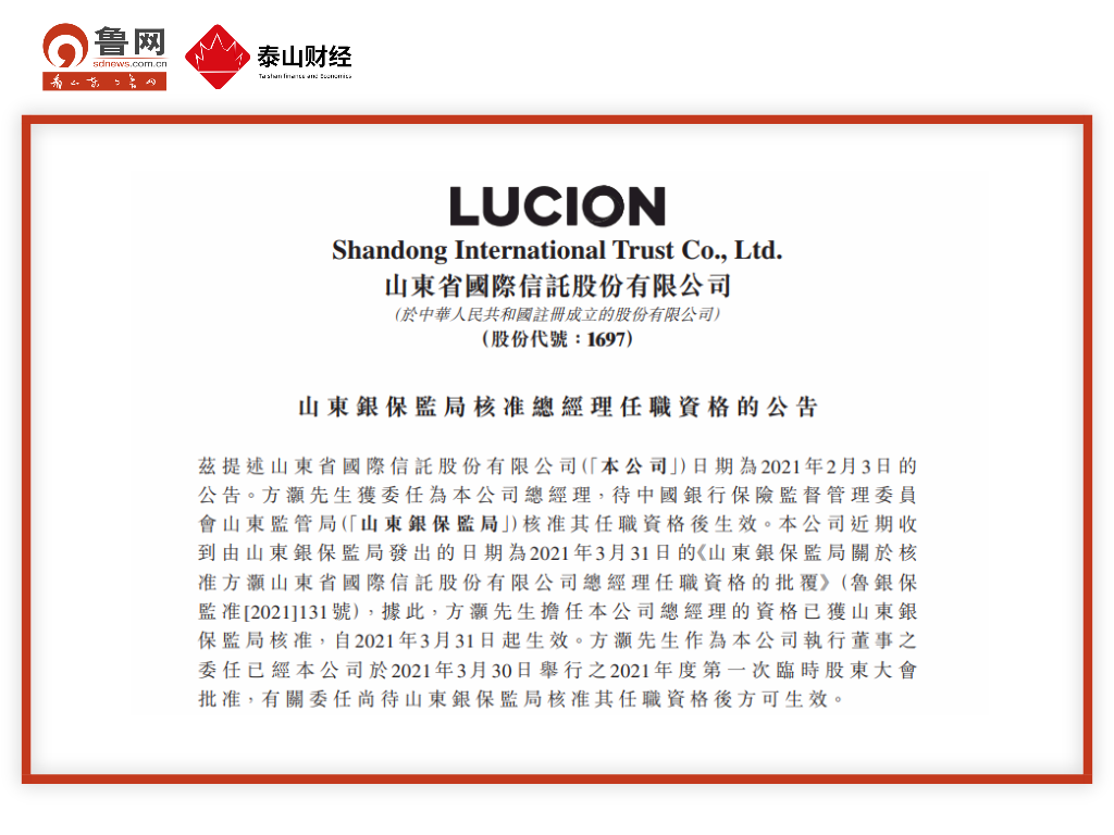 公告显示,公司近期收到由山东银保监局发出的日期为2021年3月31日的《山东银保监局关于核准方灏山东省国际信托股份有限公司总经理任职资格的批复》(鲁银保监准[2021]131号),据此,方灏担任公司总经理的资格已获山东银保监局核准,自2021年3月31日起生效。此外,方灏作为公司执行董事的委任已经公司于2021年3月30日举行的2021年度第一次临时股东大会批准,有关委任尚待山东银保监局核准其任职资格后方可生效。