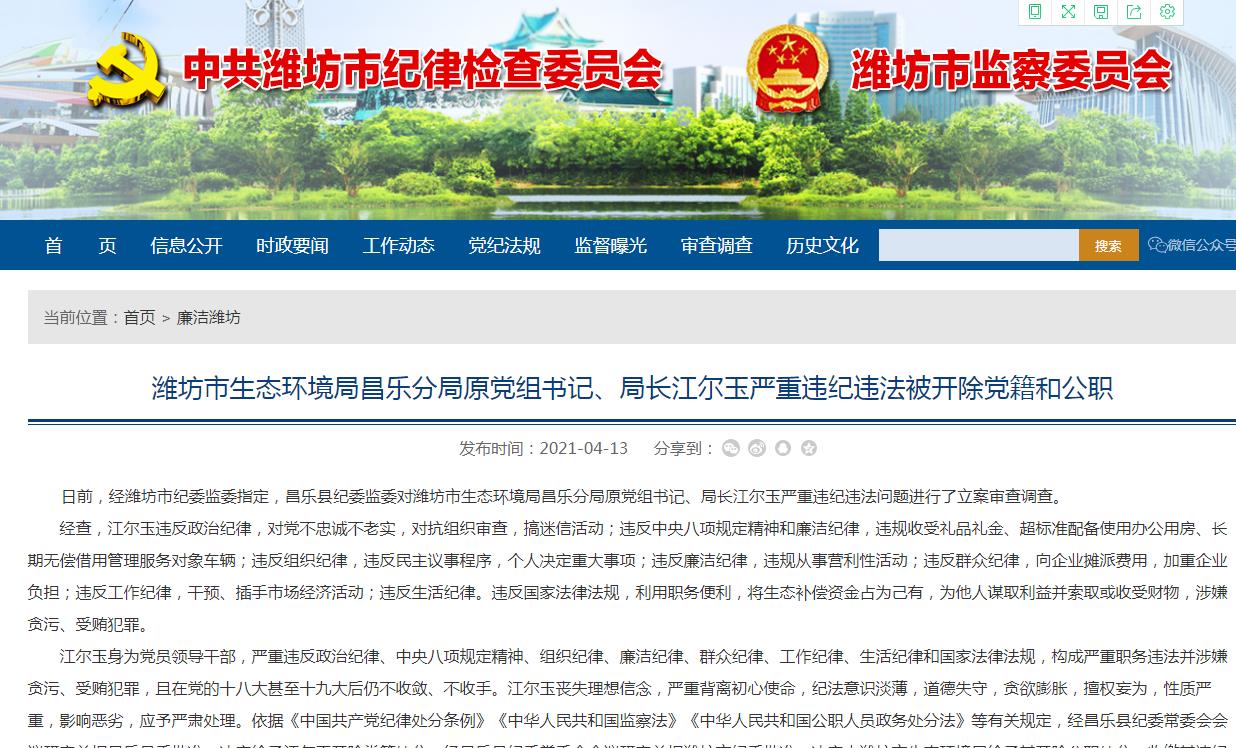 13日,鲁网·泰山财经记者从潍坊市纪委监委网站获悉,日前,经潍坊市纪委监委指定,昌乐县纪委监委对潍坊市生态环境局昌乐分局原党组书记、局长江尔玉严重违纪违法问题进行了立案审查调查。