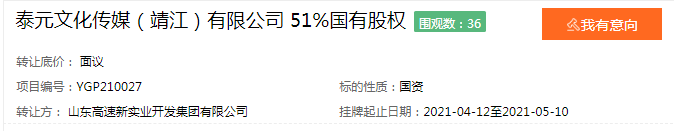 今日,鲁网·泰山财经记者从山东产权交易中心获悉,山东高速新实业开发集团有限公司(简称“山东高速新实业集团”)发布预披露信息,拟转让泰元文化传媒(靖江)有限公司(简称“泰元文化传媒(靖江)公司”)51%股权,转让底价面议,预挂牌时间截止至5月10日。企查查显示,泰元文化传媒(靖江)公司系山东高速新实业集团唯一一家在苏控股企业。