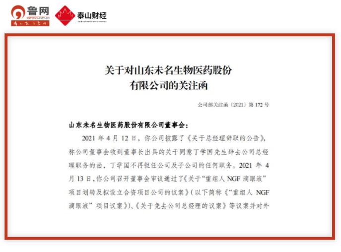 14晚间,深交所向山东未名生物医药股份有限公司(未名医药.002581.SZ)下发关注函,要求未名医药对丁学国已辞职的情况下董事会审议免去丁学国总经理职务的原因等事项进行说明。