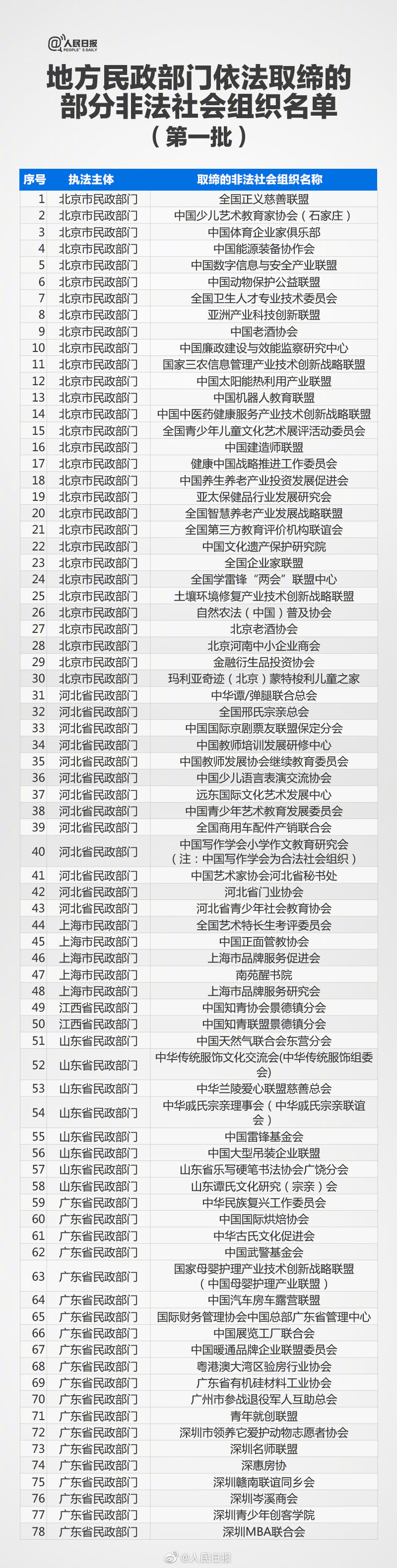 民政部今日公布一批地方民政部门近年来依法取缔的部分非法社会组织名单,共计78家,包括“全国正义慈善联盟”“中国武警基金会”等。社会公众如发现名单中的非法社会组织仍在开展活动的,可依法向公安机关报案。也可通过“中国社会组织政务服务平台”(www.chinanpo.gov.cn)提供涉嫌非法社会组织活动线索。