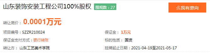 底价1元,即可参与一家企业100%股权转让项目。今日,鲁网·泰山财经记者在山东产权交易中心获悉,山东工艺美术学院(简称“山东工艺美院”)正式挂牌转让山东装饰安装工程公司100%股权,转让时间截至5月17日,值得注意的是,此次股权转让底价仅1元。