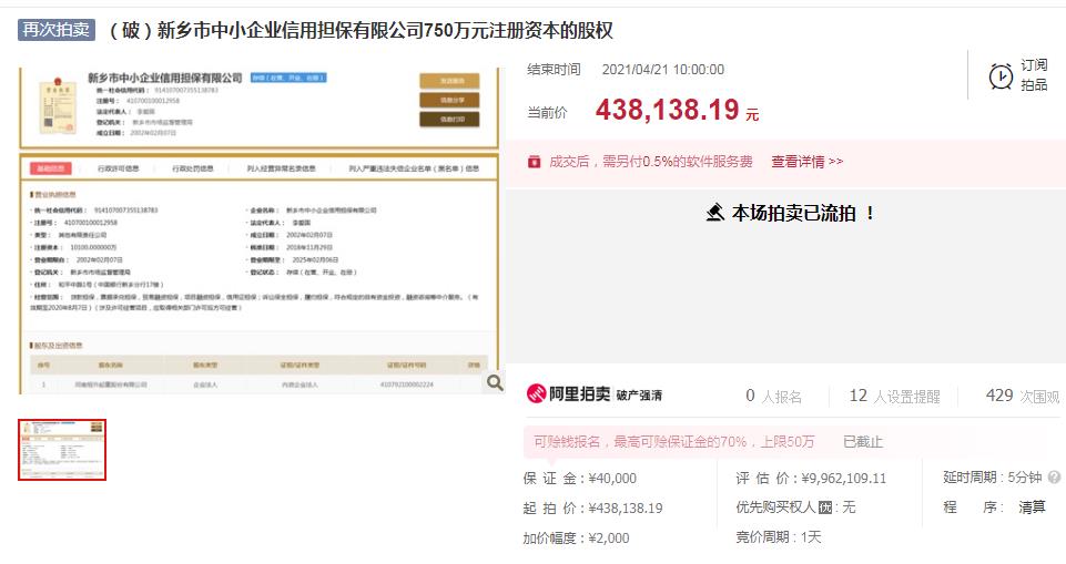 今日,鲁网·泰山财经记者从阿里拍卖平台获悉,新乡市人民政府控股子公司河南省新乡市中小企业信用担保有限公司7.47%股权拍卖又流拍了,据悉,该部分股权原由河南恒升起重股份有限公司(简称“恒升起重”)持有,2020年9月,该企业因“明显缺乏清偿能力”被法院宣告破产。鲁网·泰山财经记者注意到,该部分股权评估价996.21万元,起拍价43.81万元,截至目前,该拍卖信息虽有429次围观,但0人报名。据恒升起重管理人透露:“本次拍卖已超10轮了,一直降价却无人报名。”