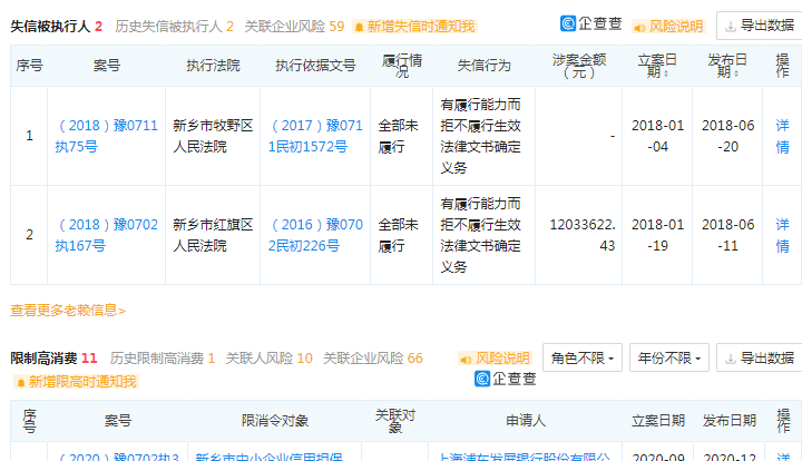 此外,该企业曾在2018年两度因“有履行能力而拒不履行生效法律文书确定义务”,被新乡市牧野区人民法院、新乡市红旗区人民法院列为失信被执行人。2018年至2020年期间,该企业还曾11次被限制高消费,目前执行标的总金额7656.25万元,未履行总金额7110.87万元,未履行比例为92.88%。