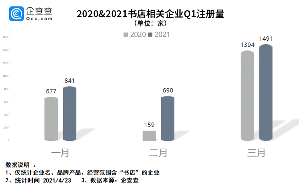 企查查数据显示,2021年第一季度,我国书店相关企业注册量为3022家,同比增长35.5%。其中,1-3月注册量分别为841家、690家和1491家。