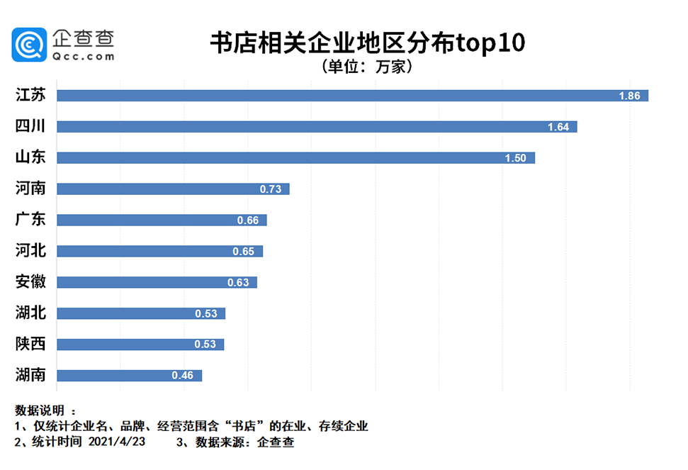 今天是第26个“世界读书日”,在数字阅读的巨大冲击下,实体书店的发展近年来面临着不少挑战。企查查数据显示,目前我国共有12.9万家书店相关企业,从地区分布来看,江苏省以1.86万家企业位居第一,四川、山东分列二、三位。