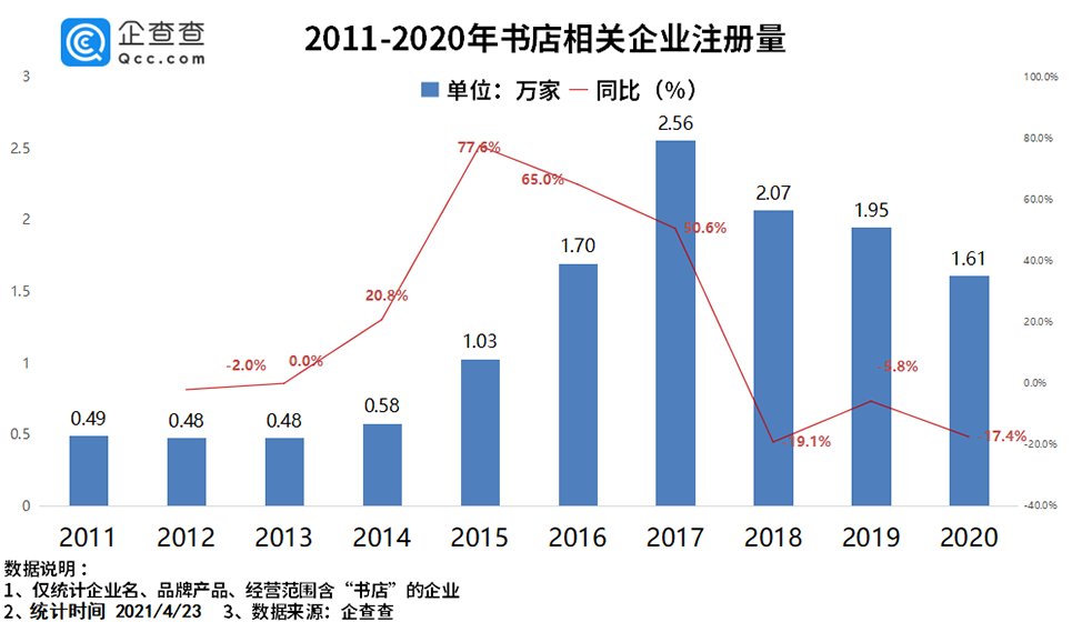从近十年书店行业发展状况来看,企查查数据显示,2017年是相关企业年注册量最多的一年,达到2.56万家,随后连续三年呈下降趋势,2020年新注册企业1.61万家,同比下降17.4%。