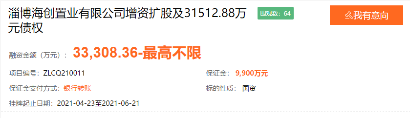 今日,鲁网·泰山财经记者在山东产权交易中心获悉,中国海外集团有限公司(简称“中海集团”)批复同意旗下控股企业淄博海创置业有限公司(简称“淄博海创置业”)增资扩股申请。据悉,淄博海创置业原为淄博海新建设有限公司(简称“海新建设”)全资企业,此次拟募集3.33亿元(对应持股比例49%),通过增资扩股引1家战投加入,挂牌期到6月21日截止。据悉,意向投资方(或其控股股东)为央企且被2020年美国财富杂志评为世界500强前20强将优先受让。