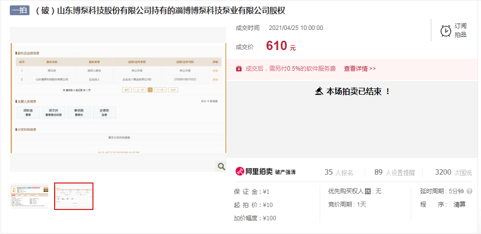 据公告显示,此次博泵公司转让所持博泵泵业51%股权,是因破产所致,拍卖起拍价为10元,参拍保证金1元,增价幅度100元。鲁网·泰山财经记者注意到,此次拍卖共经过7轮竞拍,最终610元成交,共有3200次围观,35人报名,89人设置了提醒。