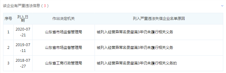 此外,企查查显示,该企业曾于2018年2月,被淄博市博山区人力资源和社会保障局依据《劳动保障监察条例》相关规定,作出行政处罚,总计1.2万元。同年11月,该企业又因“公示企业信息隐瞒真实情况、弄虚作假的”,被淄博市市场监督管理局列入经营异常名录。