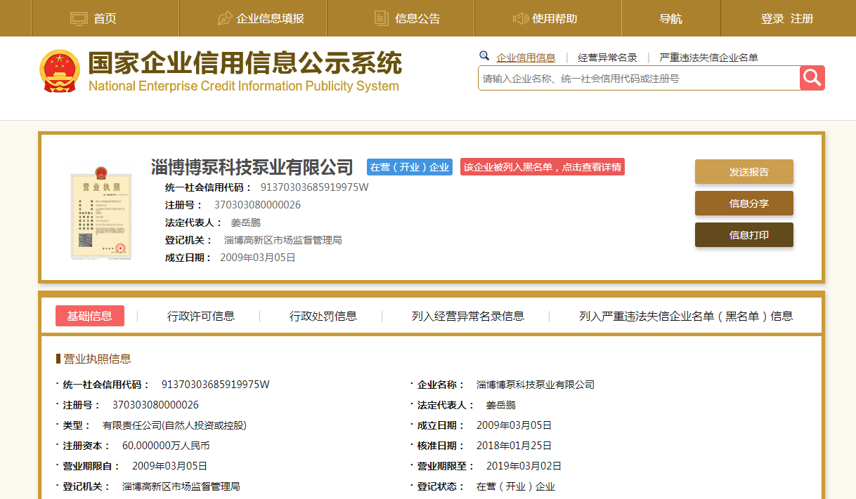 除资产情况外,博泵泵业自身情况令人堪忧。据企查查显示,从2018年7月起,连续三年因“被列入经营异常名录届满3年仍未履行相关义务”,被山东省市场监督管理局列入严重违法失信企业“黑名单”。