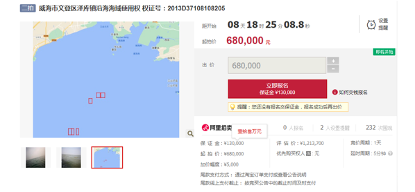 鲁网·泰山财经记者梳理发现,4月15日该海域使用权曾以85万进行一次拍卖,此次拍卖虽有738次围观,但却无人报名,最终流拍。此次二拍相较首次,已降价17万元。