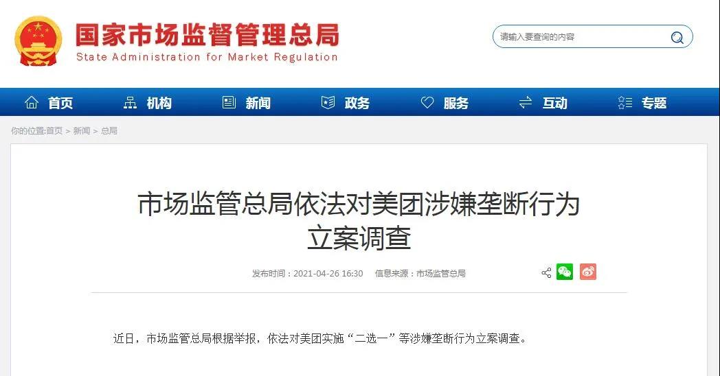 据国家市场监督管理总局26日消息,近日,市场监管总局根据举报,依法对美团实施“二选一”等涉嫌垄断行为立案调查。