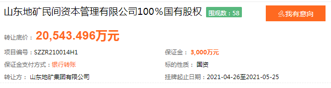 鲁网·泰山财经记者今天从山东产权交易中心获悉,山东地矿集团有限公司(简称“山东地矿集团”)正第三次挂牌转让山东地矿民间资本管理有限公司(简称“地矿民资”)100%股权,转让底价2.05亿元,较首次挂牌降价5135.87万元。此次挂牌期为4月26日至5月25日。