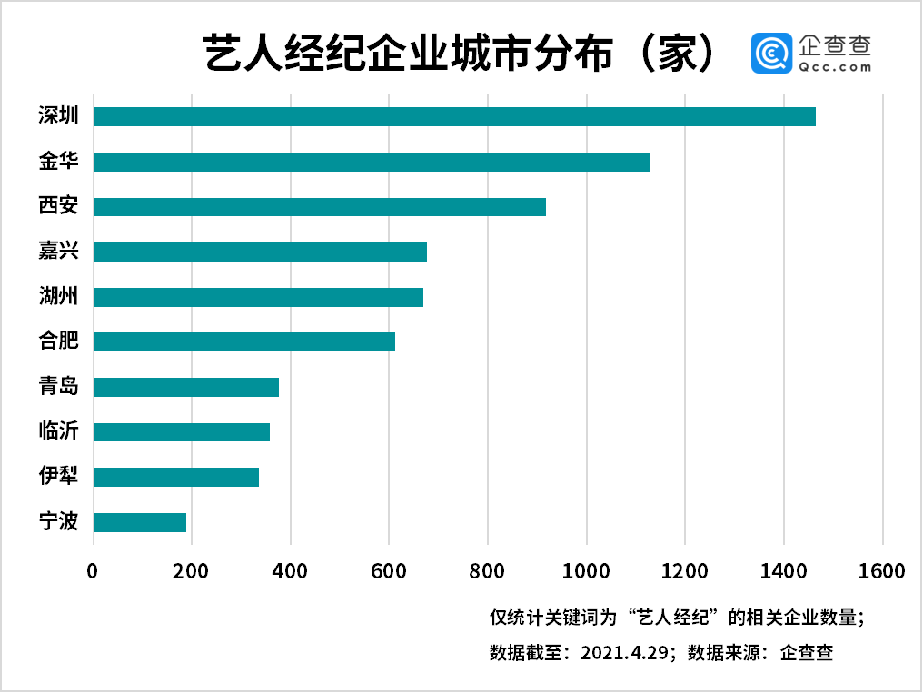 在地域分布方面,目前浙江省有3037家艺人经纪企业,在全国省份中排名首位。广东和陕西两省的艺人经纪企业数量均超过一千家,分别有1699家和1009家,排名前三。山东则以近千家企业与安徽、新疆、以及河南等省份跻身前五名。此外,从城市分布来看,深圳共有1464家艺人经纪企业,在全国城市中排名首位,青岛则作为山东省开设艺人经纪企业最多的城市,以近400家排名全国第7位。