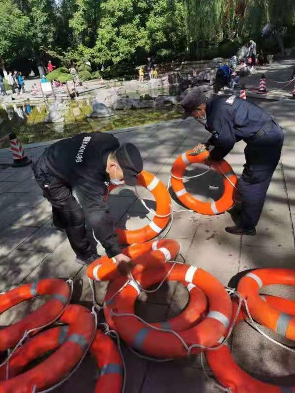 为应对客流高峰,五龙潭景区在重点临水区域安装了临时性警示带或防护链,增加了警示标识牌。安装临时性分流护栏,确保节日游园安全。加强节日期间卫生保洁力度,重点做好泉池、河面、路面、厕所的保洁及消毒工作,加强门口及重点区域消毒工作。加大经营点管理力度,确保文明优质服务,售卖合格商品。