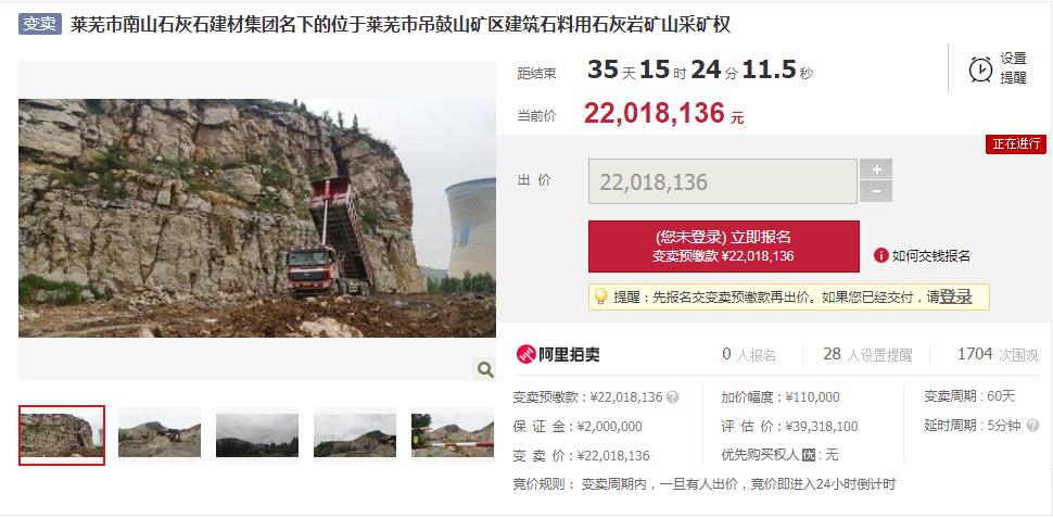今日,鲁网·泰山财经记者在阿里拍卖平台注意到,4月14日莱芜区吊鼓山矿区建筑石料用石灰岩矿山采矿权启动了第3轮拍卖,截至目前仍无人报名。据悉,该矿山生产规模52万吨/年,原属莱芜市南山石灰石建材集团,目前已被法院查封。