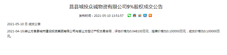 今日,鲁网·泰山财经记者从山东产权交易中心获悉,莒县国有资产监督管理局(简称“莒县国资”)旗下莒县城市建设投资集团有限公司已与受让人签订产权交易合同,以1千元成功转让莒县城投众诚物资有限公司(简称“众诚物资”)9%股权,据悉该项目挂牌价1千元,评估价481元。