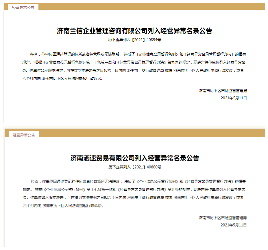 11日,济南市历下区市场监督管理局(简称“历下区市监局”)连发两则公告,“喊话”济南兰信企业管理咨询有限公司(简称“兰信企业管理咨询公司”)、济南洒速贸易有限公司(简称“洒速贸易”),两家企业再次因“失联”列入经营异常名录。鲁网·泰山财经记者注意到,两家企业注册地均在济南市泉城路264号。