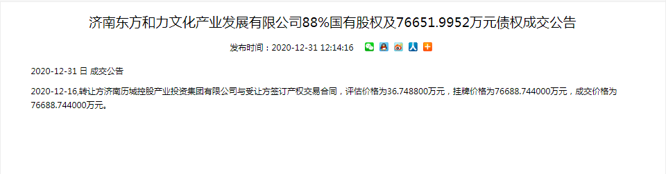 去年11月,济南历城控股产投集团曾将济南东方和力文化产业发展有限公司88%股权及7.67亿元债权进行挂牌转让,挂牌价为7.67亿元。随后在12月底山东产权交易中心发布成交信息,济南历城控股产投集团与受让方签订产权交易合同,评估价格为36.75万元,挂牌价格为7.67亿元,成交价为7.67亿元。企查查显示,目前该企业股权已变更为山东鹏逸置业有限公司持股55%,湖北省中小企业金融服务中心有限公司持股30%,济南历城控股产投集团持股12%。