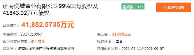 据公告,悦城置业项目挂牌价格为4.19亿元,其中企业99%股权挂牌价为9.55万元,另有4.18亿元系济南历城控股产投集团及关联企业持有的4.18亿元债权挂牌价。