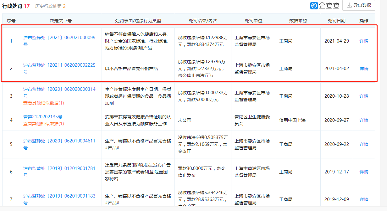 企查查显示,无印良品因销售不符合保障人体健康和人身、财产安全的国家标准、行业标准、地方标准(仅限条例)产品被没收违法所得0.122988万元,罚款3.834374万元。因以不合格产品冒充合格产品,被没收违法所得0.29796万元,罚款1.27332万元,责令停止违法行为。两次处罚单位均为上海市静安区市场监督管理局。