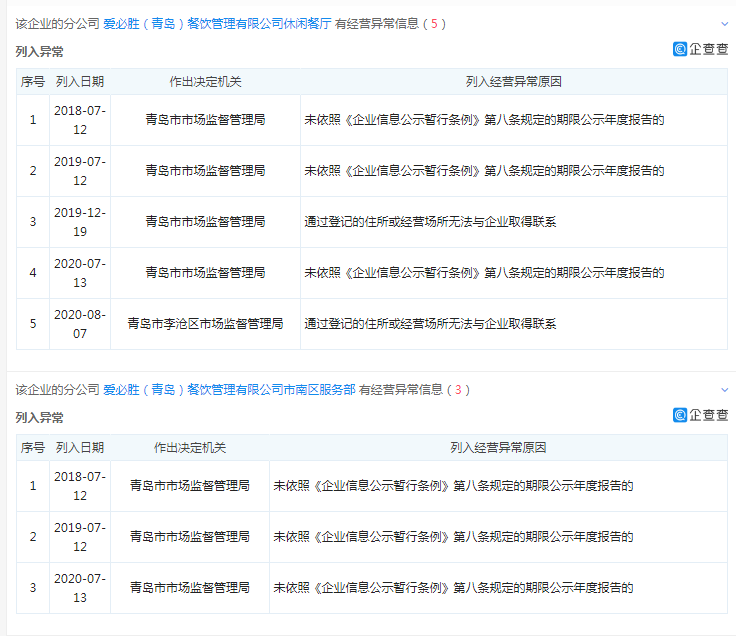 爱必胜(青岛)餐饮管理有限公司市南区服务部则在2018年至2020年期间,因“未依照《企业信息公示暂行条例》第八条规定的期限公示年度报告”, 被青市监局列入失联名单。