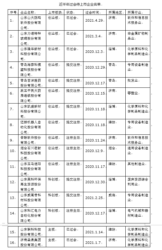 近一年来,山东企业迎来上市高潮,不仅中农联合、新风光电子科技股份有限公司等企业纷纷加入资本市场,截至目前,仅在创业板、科创板中,山东就有日日顺供应链科技股份有限公司已受理,青岛思普润水处理股份有限公司等10家企业已问询等待上会闯关,这也意味着,山东企业2021年A股过会数量可能会再创新高。