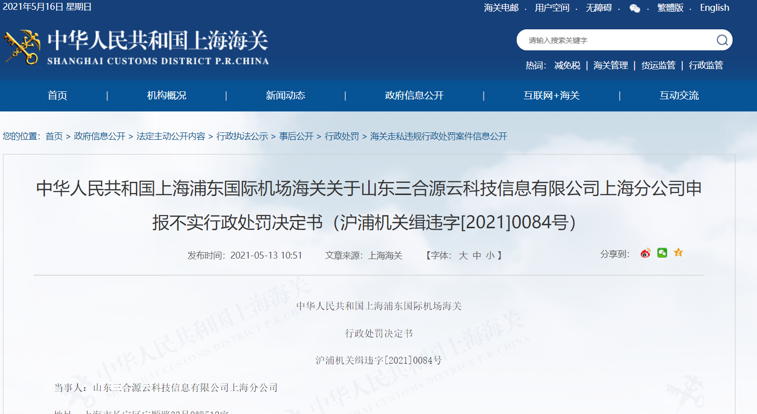 近日,中华人民共和国上海海关公布了中华人民共和国上海浦东国际机场海关关于山东三合源云科技信息有限公司上海分公司申报不实行政处罚决定书(以下简称“处罚决定书”)。