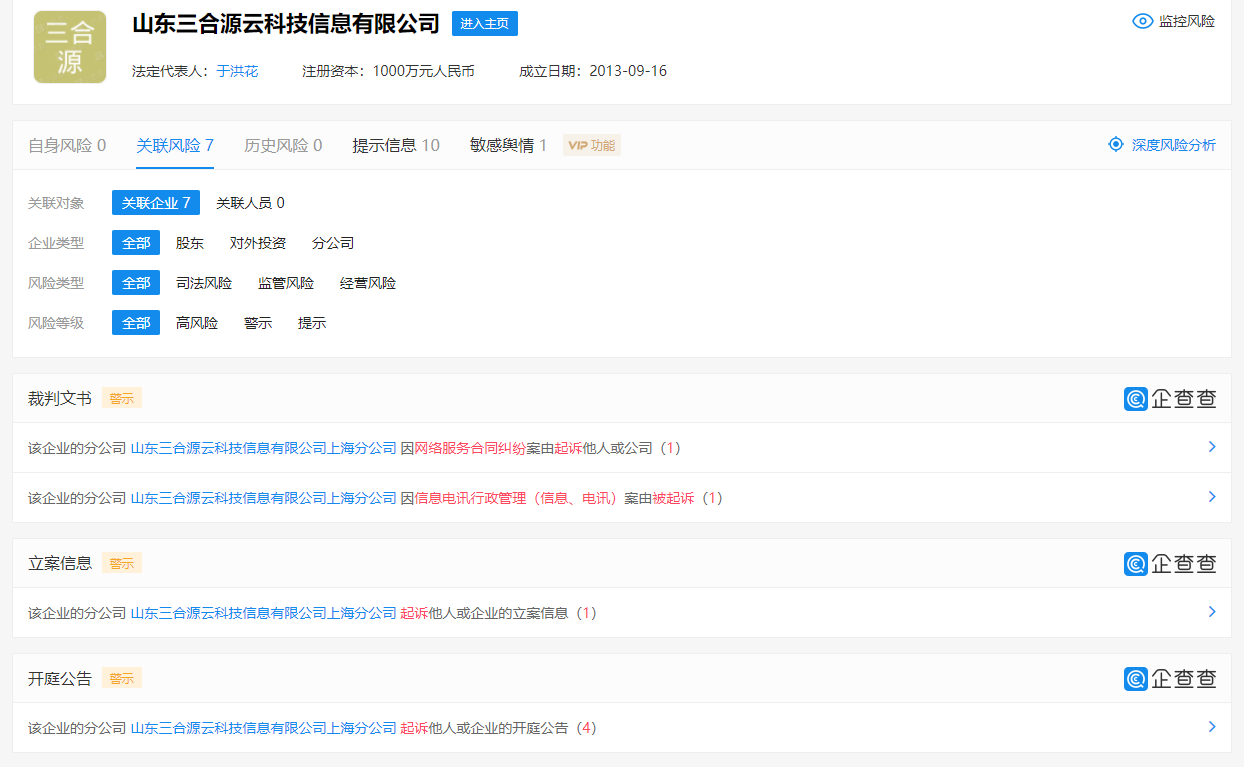 据悉,山东三合源云科技信息有限公司成立于2013年,法定代表人为于洪花,注册资本为1000万元人民币,经营范围包含:代理国际快递(邮政企业专营业务除外)(有效期限以许可证为准);计算机网络系统的研发、推广和应用,网络工程技术咨询,网站建设,网上贸易代理,货物和技术的进出口,国际、国内货运代理等。鲁网·泰山财经记者注意到,企查查所显示的该公司风险信息中,关联风险7条,均来自山东三合源云科技信息有限公司上海分公司。