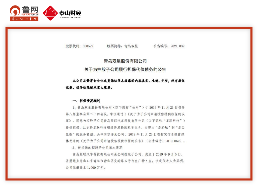 青岛双星表示,鉴于星联科技目前处于业务快速扩展期,且轮胎租赁需求资金量大,如果由其偿付该银行借款,将影响其经营的正常开展。为此,在星联科技无法按期偿付该银行借款的情况下,公司根据与青农商行签署的《保证合同》的约定,于今年5月13日代偿了上述借款1000万元。