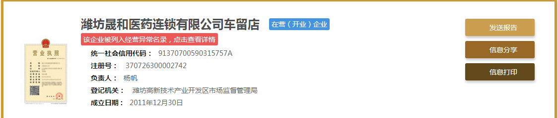 近日,潍坊晟和医药连锁有限公司(简称“晟和医药”)被潍坊高新技术产业开发区市场监督管理局(简称“潍坊高新区市监局”)“喊话”,公司旗下一门店因“失联”被列入经营异常名录。
