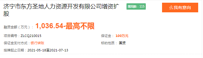 今日,鲁网·泰山财经记者在山东产权交易中心获悉,济宁市国有资产投资控股有限公司(简称“济宁国投”)批复同意旗下济宁市东方圣地人力资源开发有限公司(简称“东方圣地人资公司”)增资扩股申请。据悉,东方圣地人资公司原为山东惠通管理服务集团有限公司(简称“惠通管理服务集团”)全资企业,此次拟募集1036.54万元(对应持股比例49%),通过增资扩股引1家战投加入,挂牌期到7月13日截止。