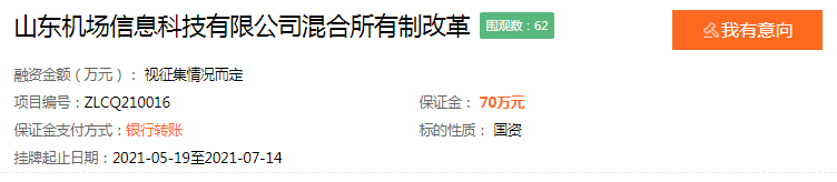 今日,鲁网·泰山财经记者从山东产权交易中心获悉,山东省机场管理集团有限公司(简称“山东省机场管理集团”)旗下山东机场信息科技有限公司拟混改,将引入2-3名战投,增资比例为20%-40%,新增注册资本不超过666.66万元。据悉,此次募资金额将视征集情况而定,用于补充该企业营运资金,业务拓展。