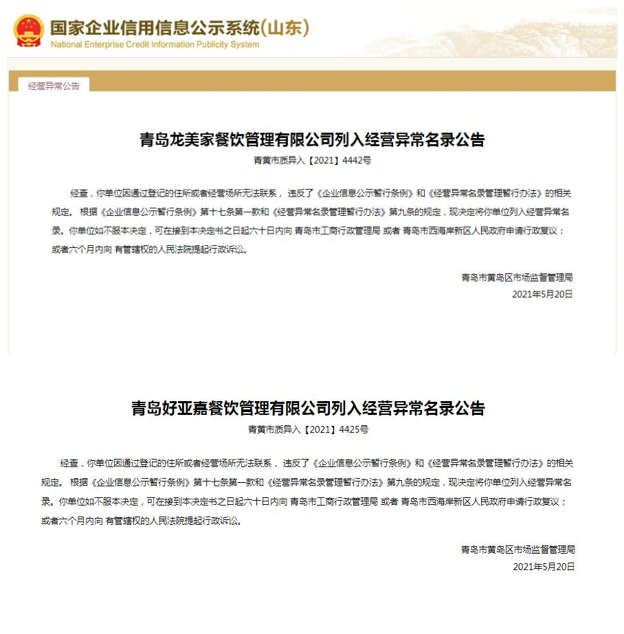 20日,国家企业信用信息公示系统披露,青岛龙美家餐饮管理有限公司(简称“龙美家餐饮”)、青岛好亚嘉餐饮管理有限公司(简称“好亚嘉餐饮”)因“失联”被青岛市黄岛区市场监督管理局(简称“黄岛区市监局”)列入经营异常名录。鲁网·泰山财经记者注意到,好亚嘉餐饮主营包括学生配餐。
