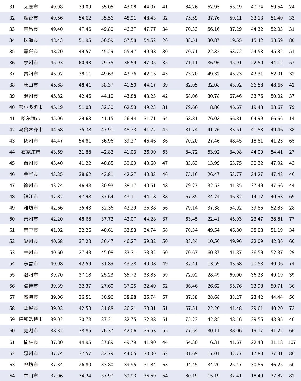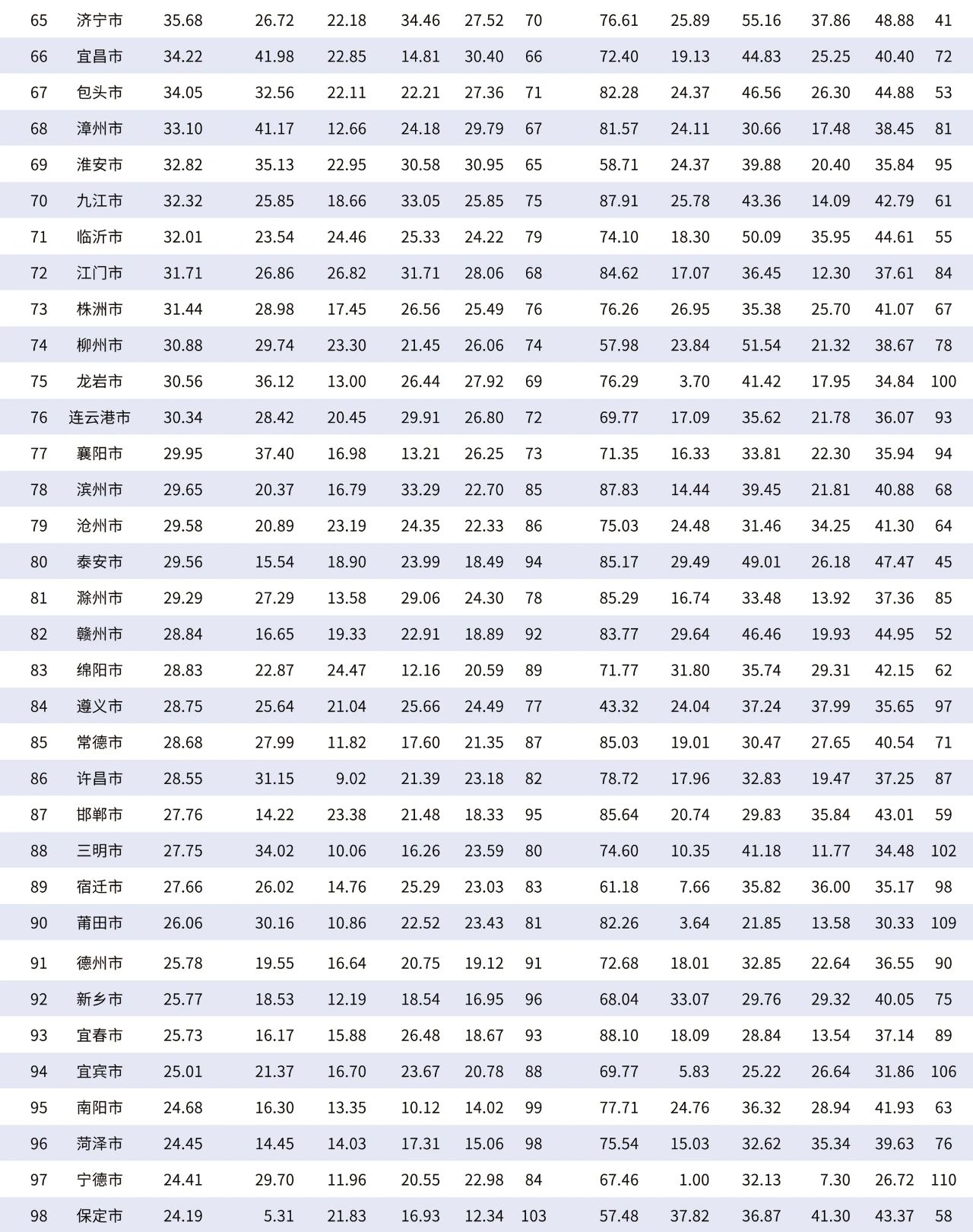 综合分值来看,济青烟位列省内前三甲,济南排名第15位、青岛排名第18位,烟台排名第32位。山东“双子星”济南和青岛都进入全国前20位。值得注意的是,济南综合分值排名比2020年提升两位,省内连续第二年排名第一。此外,滨州首次入围百强榜单。