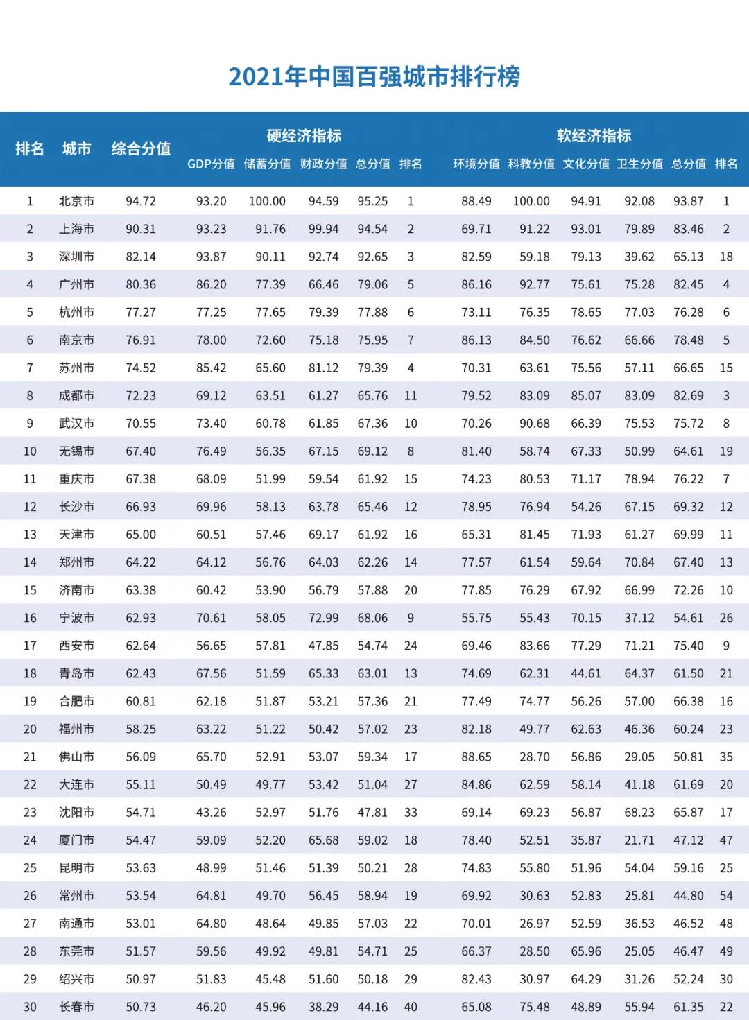 在“2021年中国百强城市排行榜”上,北京、上海高居前两位,综合分值分别为94.72和90.31。位居第三至第十位的依次是深圳(82.14)、广州(80.36)、杭州(77.27)、南京(76.91)、苏州(74.52)、成都(72.23)、武汉(70.55)和无锡(67.40)。今年滨州、宜宾和宁德三市新晋百强城市,焦作、大庆和湛江三市退出百强城市。