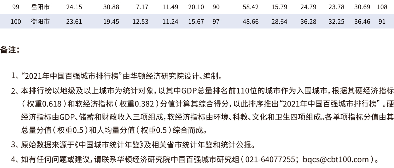 据悉,华顿经济研究院自2015年以来连续七年组织编制年度“中国百强城市排行榜”。榜单以GDP总量排名前110位的地级及以上城市作为年度入围城市,按照其硬经济指标(权重0.618)和软经济指标(权重0.382)综合得分进行排序,取前100位作为年度上榜百强城市。硬经济指标由GDP、储蓄和财政组成,软经济指标由环境、科教、文化和卫生组成。各单项指标分值由其总量分值(权重0.5)和人均量分值(权重0.5)综合而成。鲁网·泰山财经记者 于雅雯
