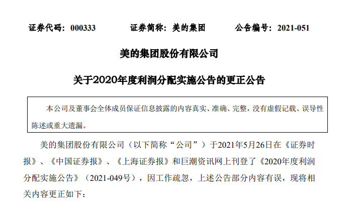 据悉,美的集团于2021年5月26日在《证券时报》、《中国证券报》、《上海证券报》和巨潮资讯网上刊登了《2020年度利润分配实施公告》(2021-049号)部分内容有误。美的集团表示,系工作疏忽。