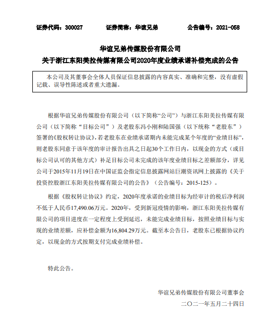 据《股权转让协议》,两方约定2020年承诺的业绩目标为经审计的税后净利润不低于1.75亿元,但因东阳美拉未完成,按照业绩目标与实现的业绩差额,应补偿金额为1.68亿元。耗时一个月后,华谊兄弟表示,该笔补偿已用现金支付完成。