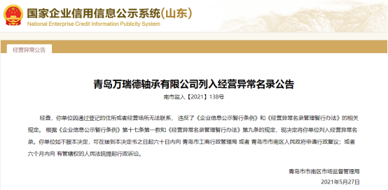 据南市监入【2021】138号公告显示,万瑞德轴承因通过登记的住所或者经营场所无法联系,违反了《企业信息公示暂行条例》和《经营异常名录管理暂行办法》的相关规定,被青岛市市南区市场监督管理局列入经营异常名录。