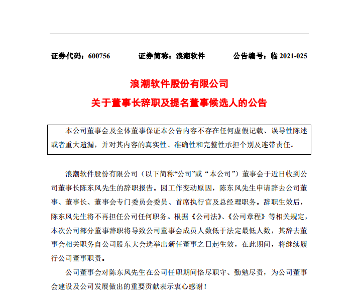 据悉,陈东风目前仍为浪潮软件法定代表人,将继续履行法定代表人职责直至该企业新任董事长接任法定代表人并完成工商变更之日止。