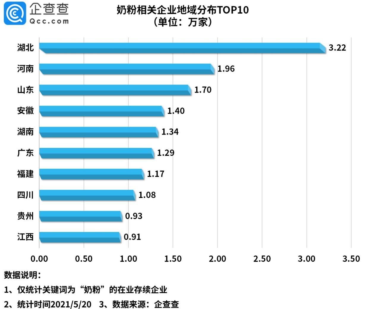 企查查查数据显示,我国目前共有超20万家“奶粉”相关企业,其中超14万家为个体工商户,从行业分类上看,超8成的企业分布在批发和零售业,湖北以3.22万家排名第一,河南、山东分列二三名。2020年,奶粉相关企业新注册2.97万家,同比下降12%,今年前4月新注册3906家,同比下降60%。