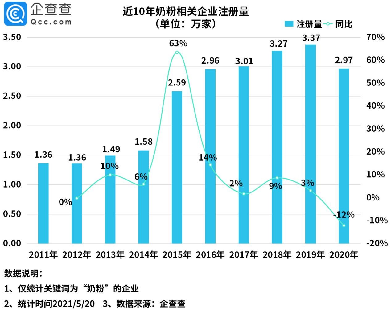 据悉,2011-2019年来我国奶粉相关企业年注册量逐年攀升,2015年增速是近10年来最高的,同比增长63%,全年注册量达到2.59万家。2019年为历年来注册量最高,新增企业3.37万家。2020年注册量略有下降,新注册企业2.97万家,同比下降12%。