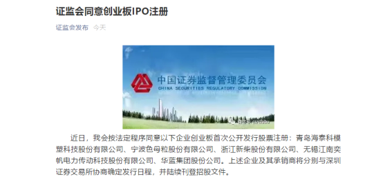 2日晚间,中国证券监督委员会(以下简称“中国证监会”)于官方微信发布公告,同意青岛海泰科模塑科技股份有限公司(以下简称“海泰科”)在内的5家企业创业板首次公开发行股票注册。