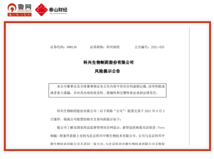 今日,科兴生物制药股份有限公司(科兴制药.688136.SH)发布风险提示公告,科兴制药股票交易于2021年 6月2日涨停。据公司了解及国家药品监督管理局官网显示,新型冠状病毒灭活疫苗(Vero细胞)附条件获批上市的为北京科兴中维生物技术有限公司,公司与其不是同一家公司,而且也无股权关系、无关联关系,提醒广大投资者注意投资风险。