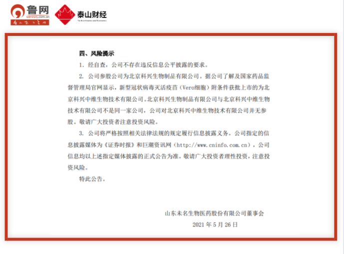 鲁网·泰山财经记者注意到,此前,山东未名生物医药股份有限公司(未名医药.002581.SZ)也曾发布公告称,公司参股公司为北京科兴生物制品有限公司。据公司了解及国家药品监督管理局官网显示,新型冠状病毒灭活疫苗(Vero细胞)附条件获批上市的为北京科兴中维生物技术有限公司。北京科兴生物制品有限公司与北京科兴中维生物技术有限公司不是同一家公司,公司对北京科兴中维生物技术有限公司并无参股。