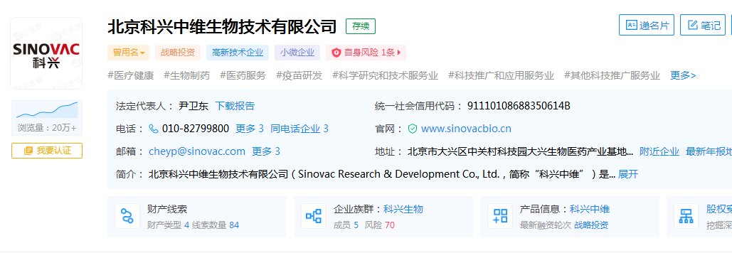 据悉,北京科兴生物制品有限公司成立于2001年,是由科兴控股(香港)有限公司(Sinovac Biotech (Hong Kong) Ltd.)、未名医药合资组建的生物高新技术企业,法定代表人潘爱华,注册资本1.41亿元人民币。经营范围包括生产生物制品、生物技术产品;开发生物制品等。鲁网·泰山财经记者注意到,未名生物医药有限公司是未名医药全资子公司,未名医药间接持股北京科兴生物制品有限公司。